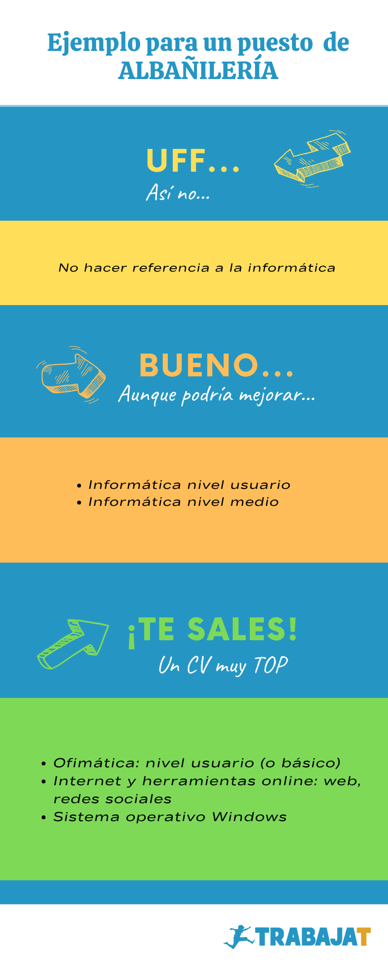 Por ejemplo, si te presentas a un puesto de albañil, no necesitas dominar Excel ni Word. Pero indicar que “te defiendes con el ordenador” puede sumar puntos: demuestra que, si la empresa implanta una aplicación o un software para el control de obras (y eso terminará ocurriendo), no partirás de cero.